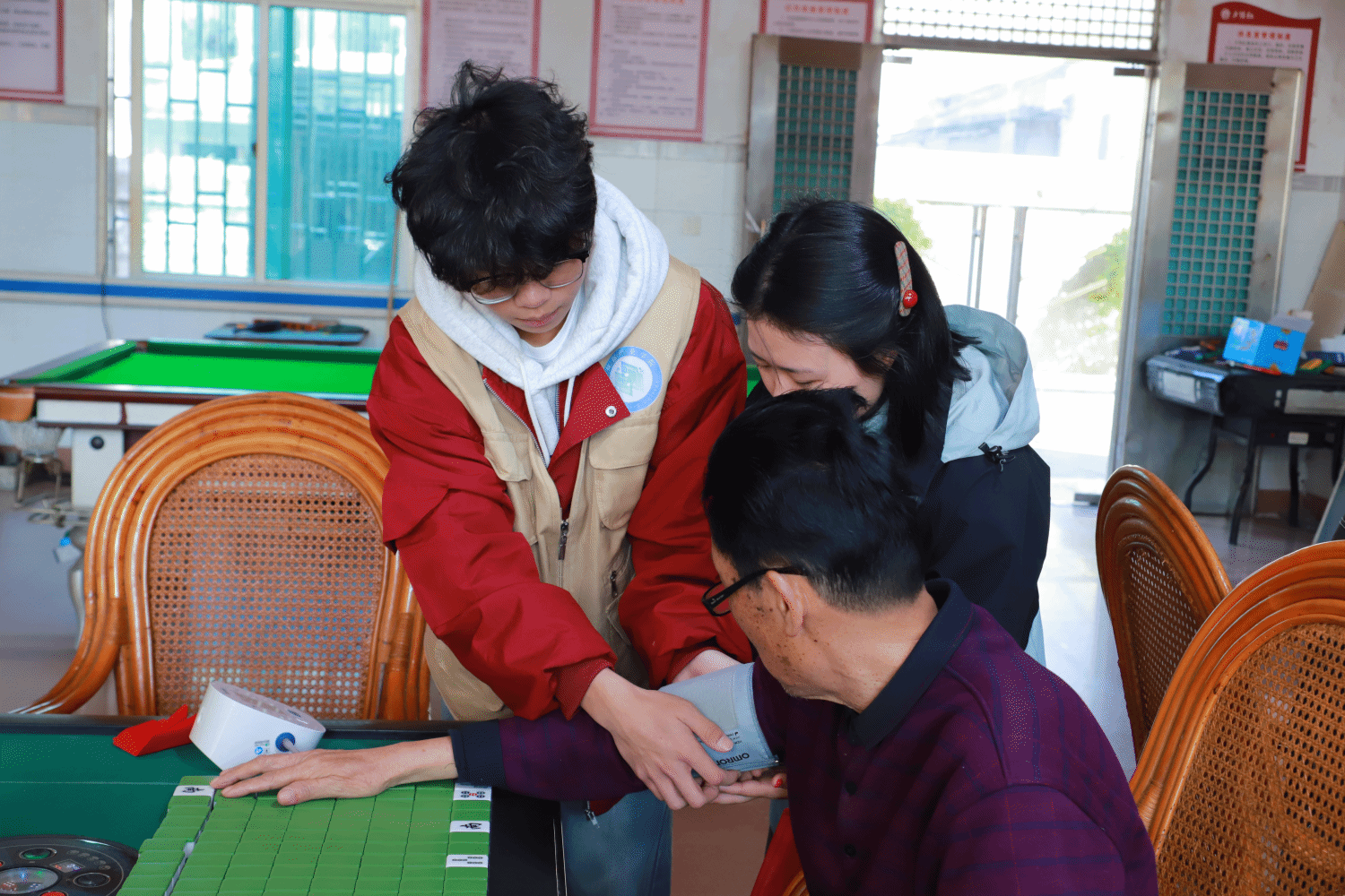 活动当天,志愿者们带着摄影设备来到百户村,在村干部的协助下布置起简易拍摄点位。面对镜头,不少老人起初略显拘谨,志愿者们主动上前与老人们拉家常、话温暖,用亲切的交谈舒缓紧张情绪。拍摄间隙,大家还贴心为老人们测量血压,耐心引导、细致操作,轻声叮嘱日常注意事项。在志愿者的陪伴与鼓励下,老人们渐渐放松下来,一张张慈祥温暖的笑脸被定格在画面之中。