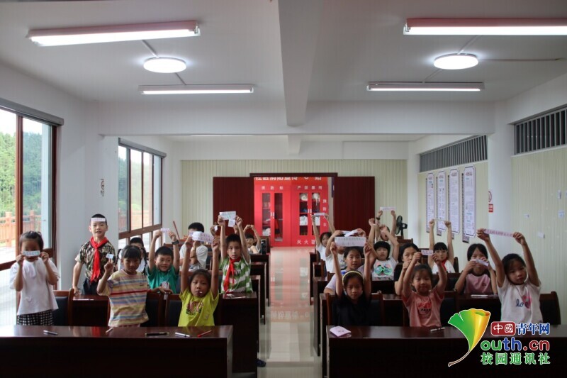 图为小朋友展示撕下的标签。胡陈龙 供图