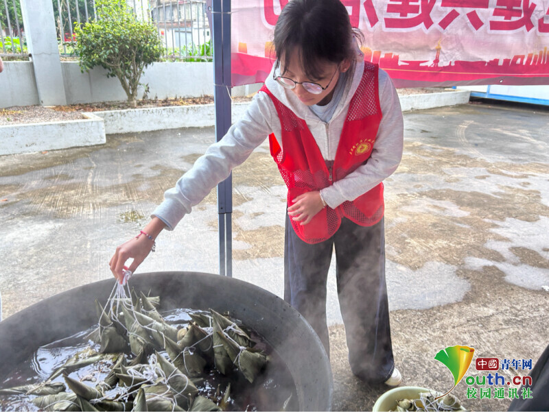 图为志愿者将包好的粽子放进锅中。谢盛妍 供图