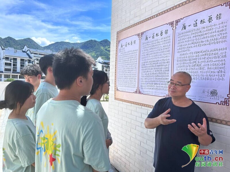 图为张长青老师向实践队员介绍根艺作品的故事。占圣雯 供图