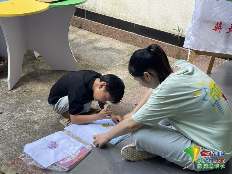图为实践队员帮助小朋友共同制作植物拓染作品。 林馨 供图