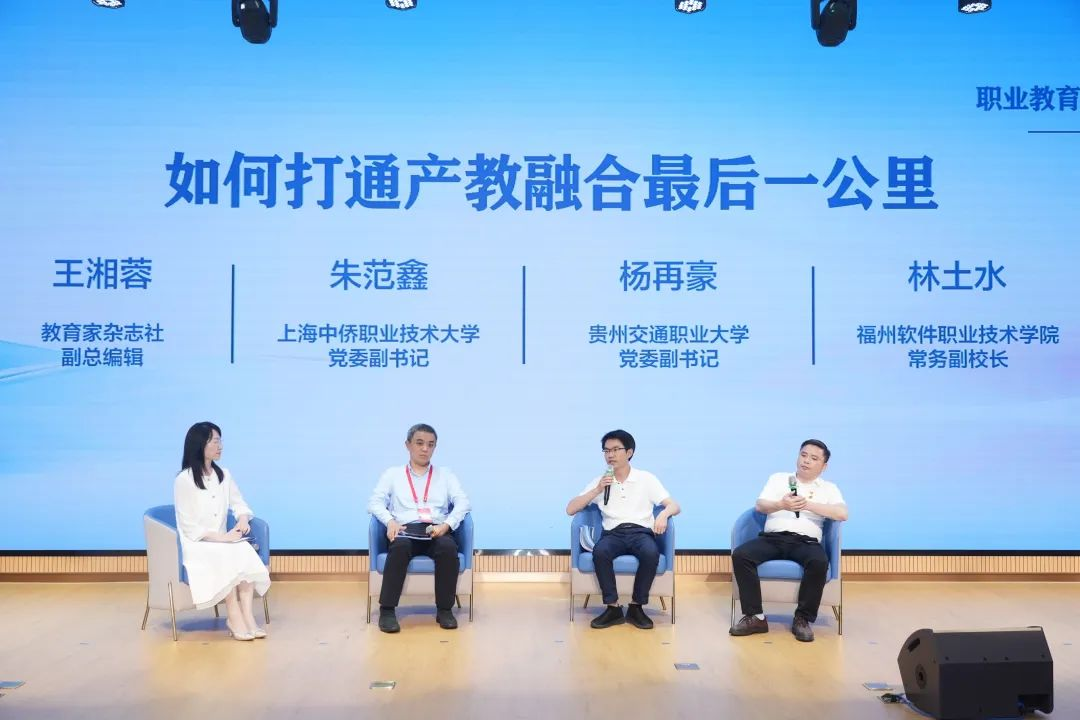 圆桌论坛环节,上海中侨职业技术大学党委副书记朱范鑫、贵州交通职业大学党委副书记杨再豪、林土水就“如何打通产教融合“最后一公里””这一话题进行讨论。