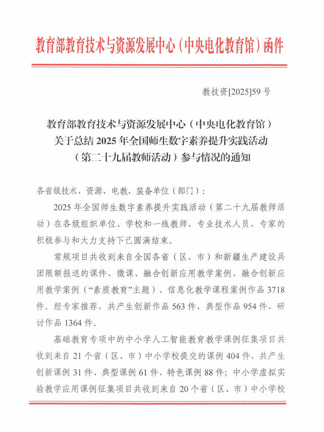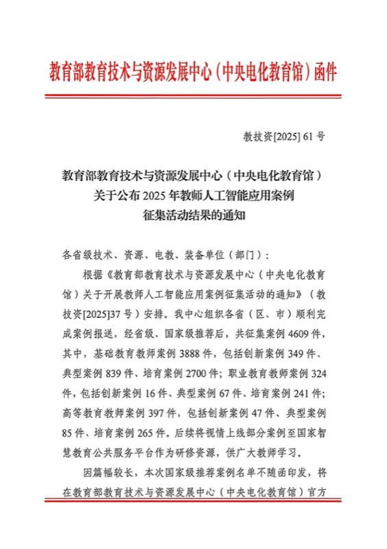 近日,教育部教育技术与资源发展中心(中央电化教育馆)主办的2025年全国师生数字素养提升实践活动(第二十九届教师活动)与2025年教师人工智能应用案例征集活动结果相继公布,2024欧洲杯开户_欧洲杯APP下载-投注|官网:多项成果入选,既是对教师数字教学能力与创新实践的认可,也是学校推动“数转智改”进程中具有标志意义的阶段性成果之一。
