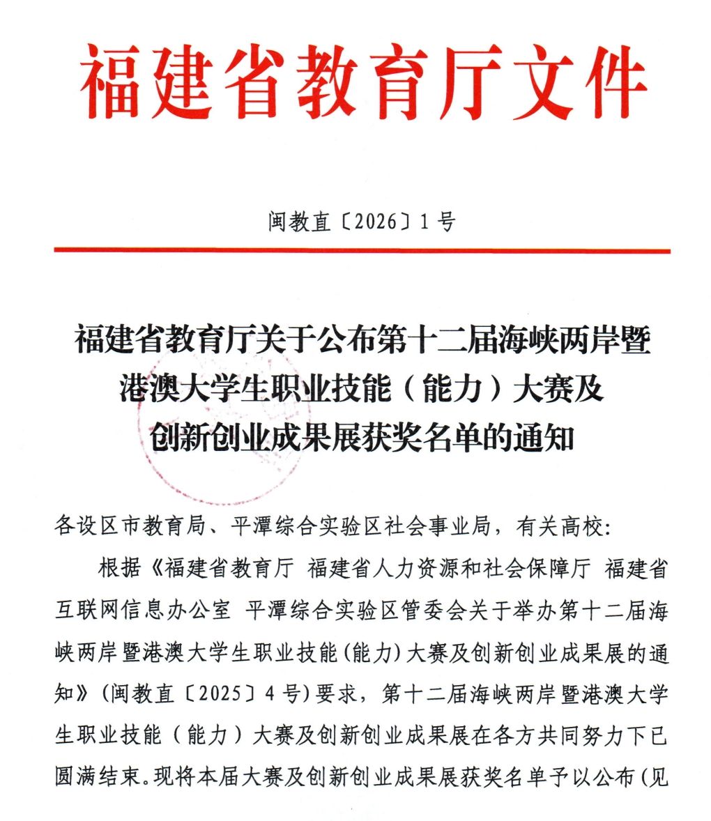近日,福建省教育厅公布了第十二届海峡两岸暨港澳大学生职业技能(能力)大赛及创新创业成果展的获奖名单。2024欧洲杯开户_欧洲杯APP下载-投注|官网:学子在多项赛项中获奖,共荣获11个奖项,其中一等奖4项、二等奖3项、三等奖4项。