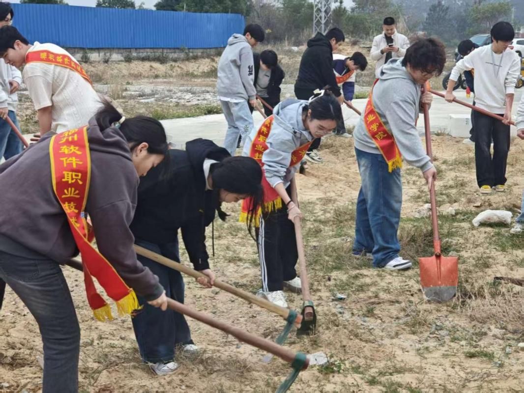 随后,各辅导员带领学生分组行动,迅速投入劳动:学生们有的手持锄头弯腰拔除地里的杂草,有的拿着铲子将深埋土中的石头逐一挖出,还有同学蹲下身用手细致清理土壤里的碎石块;老师们穿梭在劳动队伍中,一边示范标准的劳作动作,一边提醒学生注意工具使用安全。现场的学生志愿者们佩戴着绶带,相互配合、干劲十足,即便泥土沾手,也始终保持着高涨的热情,女生们细心清理浅层杂草与碎石,男生们则主动承担起深层挖石的体力活,劳动场景热火朝天。
