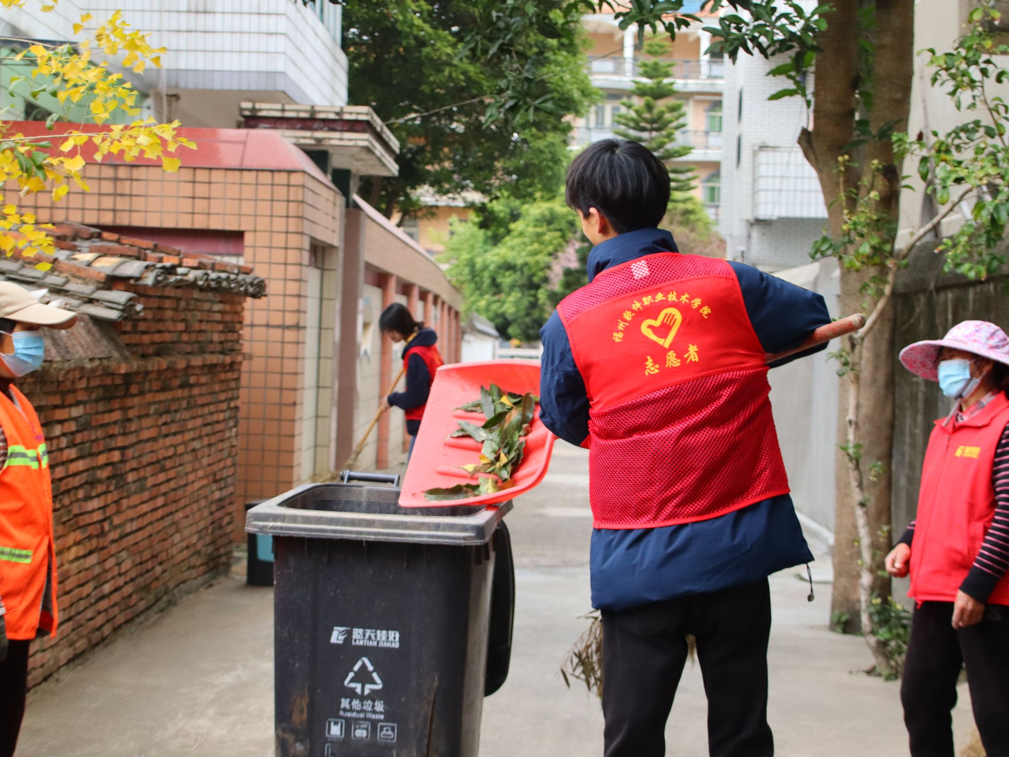 队员们手持扫帚、簸箕,与环卫工人默契配合,从主街到背巷,细致清扫路面的落叶、杂物,清理墙角和绿化带旁的卫生死角。在狭窄的老巷里,大家弯腰铲除积尘;在沿街步道上,合力搬运堆积的枯枝。