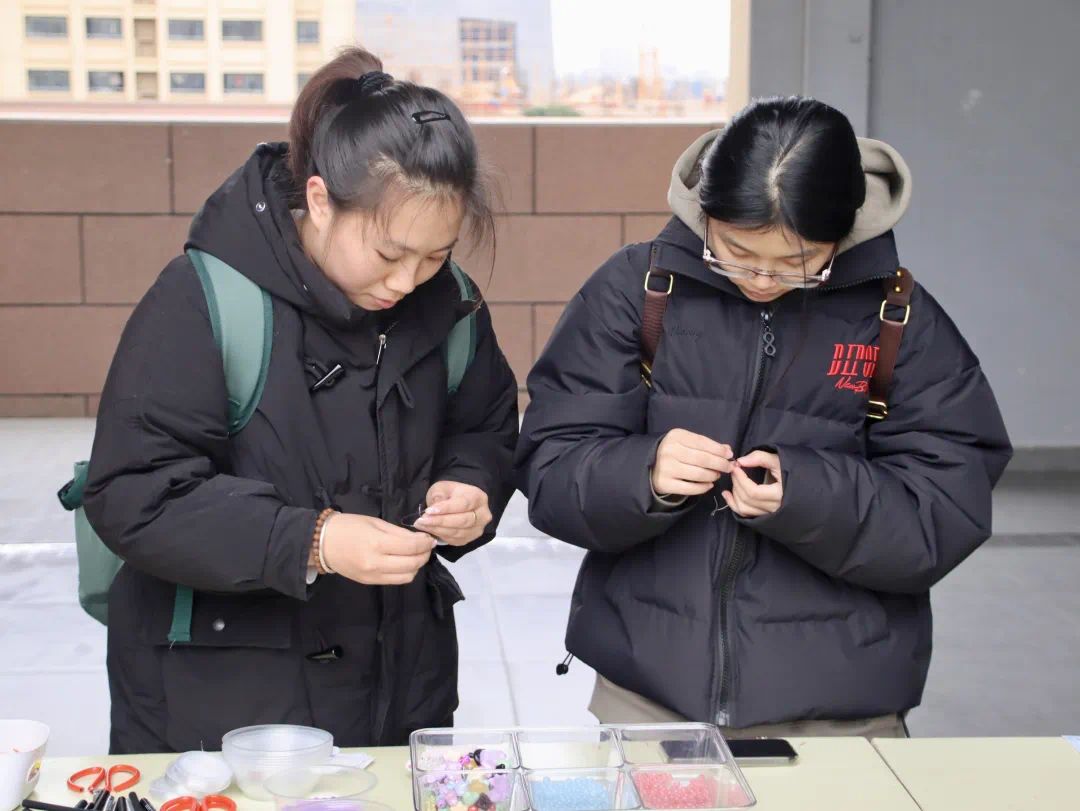 活动现场,同学们精心甄选各色串珠,于指尖穿引编织,将巧思与心意凝练成独一无二的手链。大家将成品佩戴于腕间,定格这份手作的温度与美好,以匠心致敬芳华,尽显数金学子青春向上的动人风采。