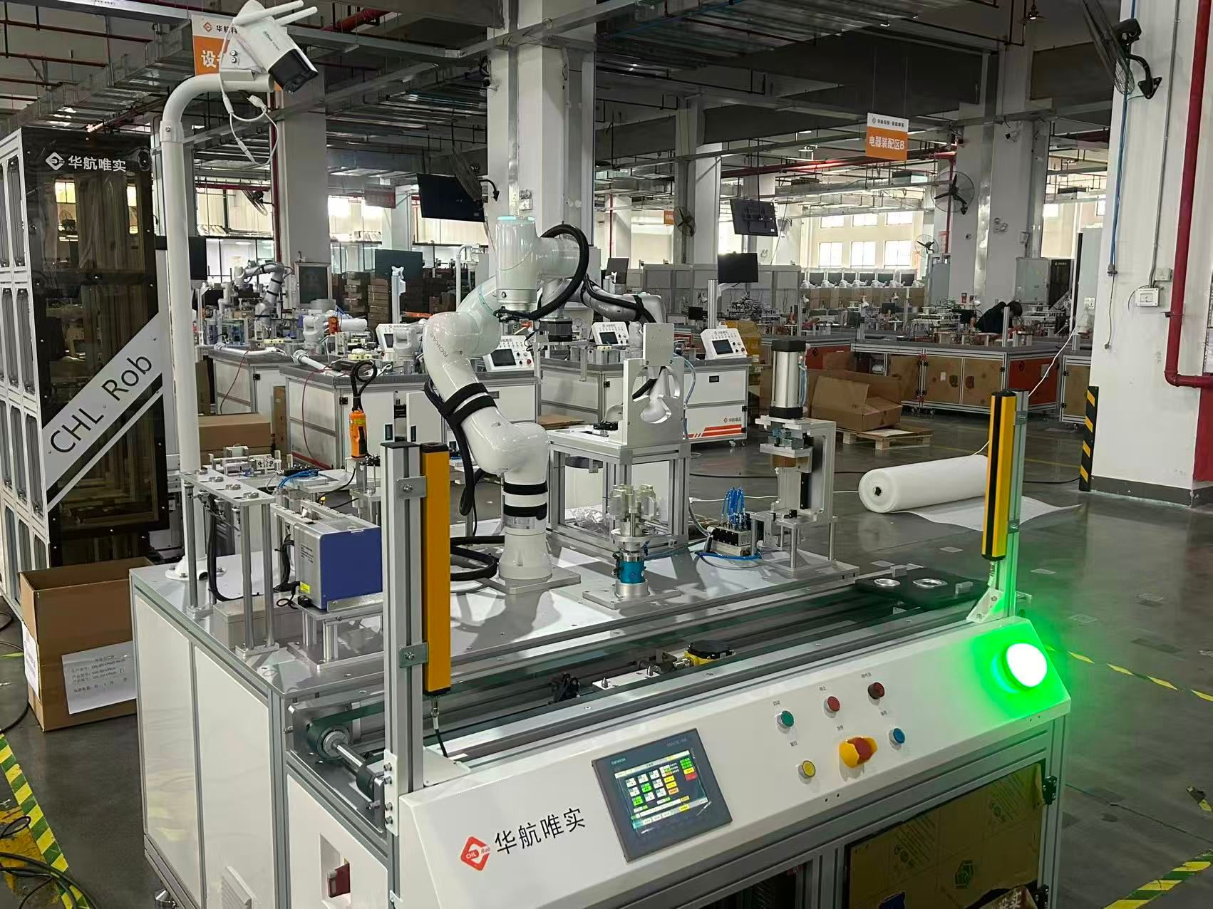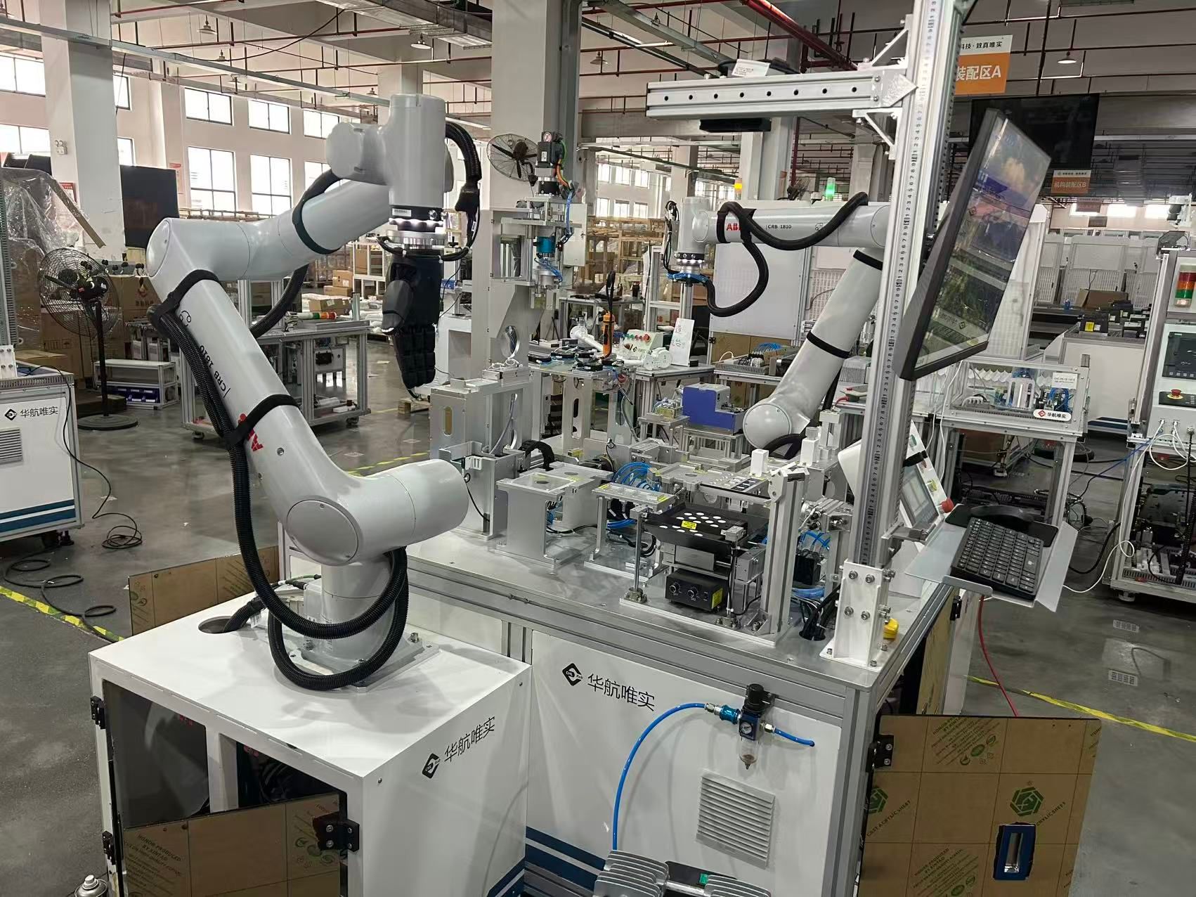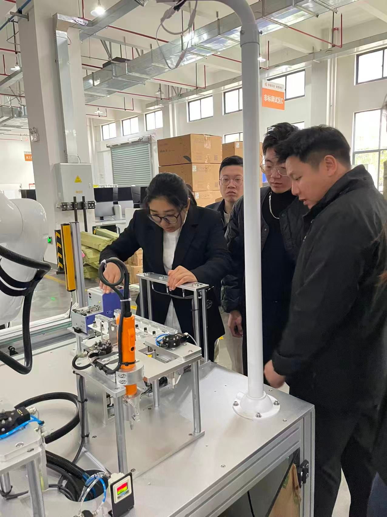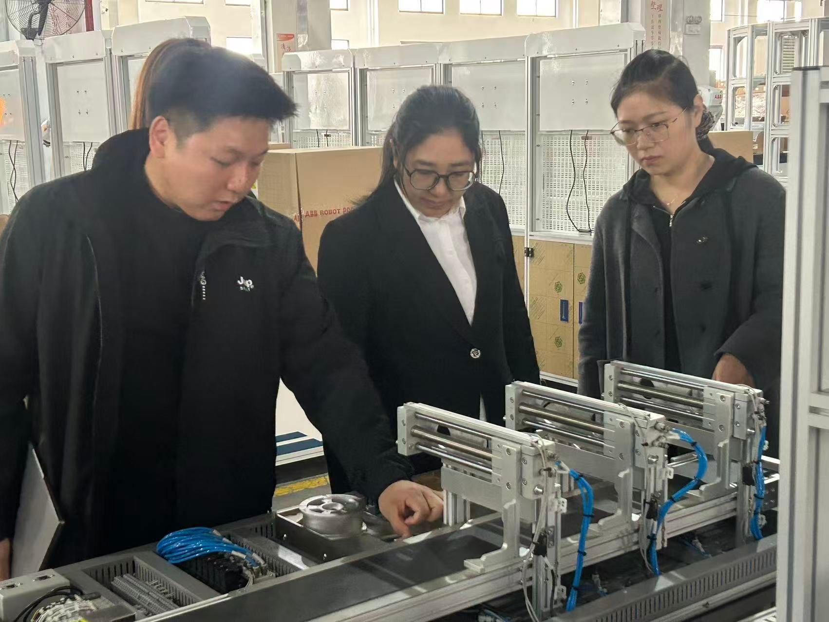 随后,调研团队前往华航唯实嘉善生产基地,该基地作为北京华航唯实机器人科技集团的核心生产载体,也是多家职业院校的校企共建实践基地,专注于工业机器人、工业互联网的研发、生产及实训设备配套。在基地负责人的引导下,团队深入生产车间与实训区域,实地参观了工业机器人在各类场景的应用展示,详细了解了不同场景对应的实训设备配置、实训课程设计等情况,观摩不同的智能制造生产线,为学院实训基地建设提供了宝贵参考。
