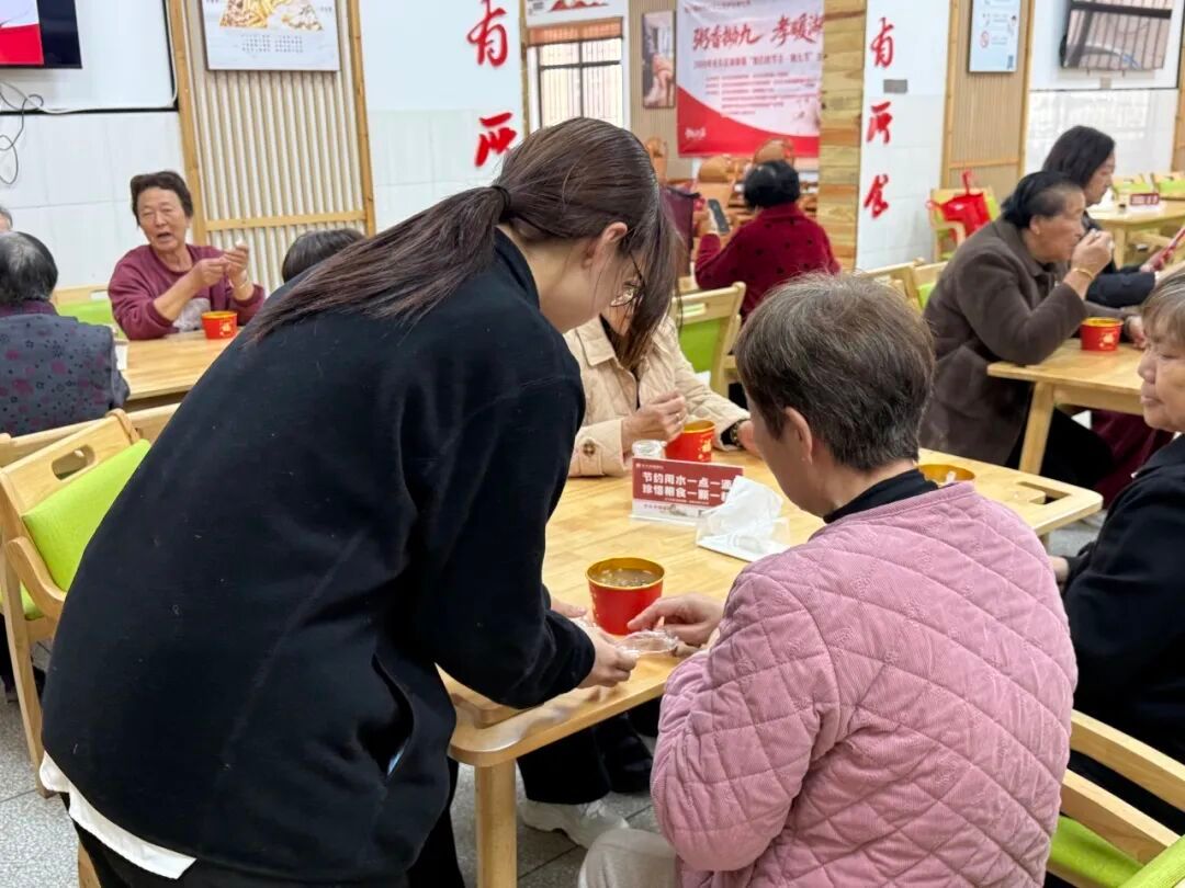 随后,孝粥共敬环节温情启幕,学生党员与镇村志愿者一同为老人盛粥奉粥,将一碗碗软糯香甜的拗九粥送到老人手中,并送上“平安健康、福寿绵长”的真挚祝福,把尊老孝亲的传统美德转化为实实在在的行动,让现场洋溢着浓浓的敬老氛围。学生党员们还主动关注老人用餐需求,及时添粥递水,用餐结束后迅速清理餐桌、打扫场地,用点滴善举践行志愿服务精神。