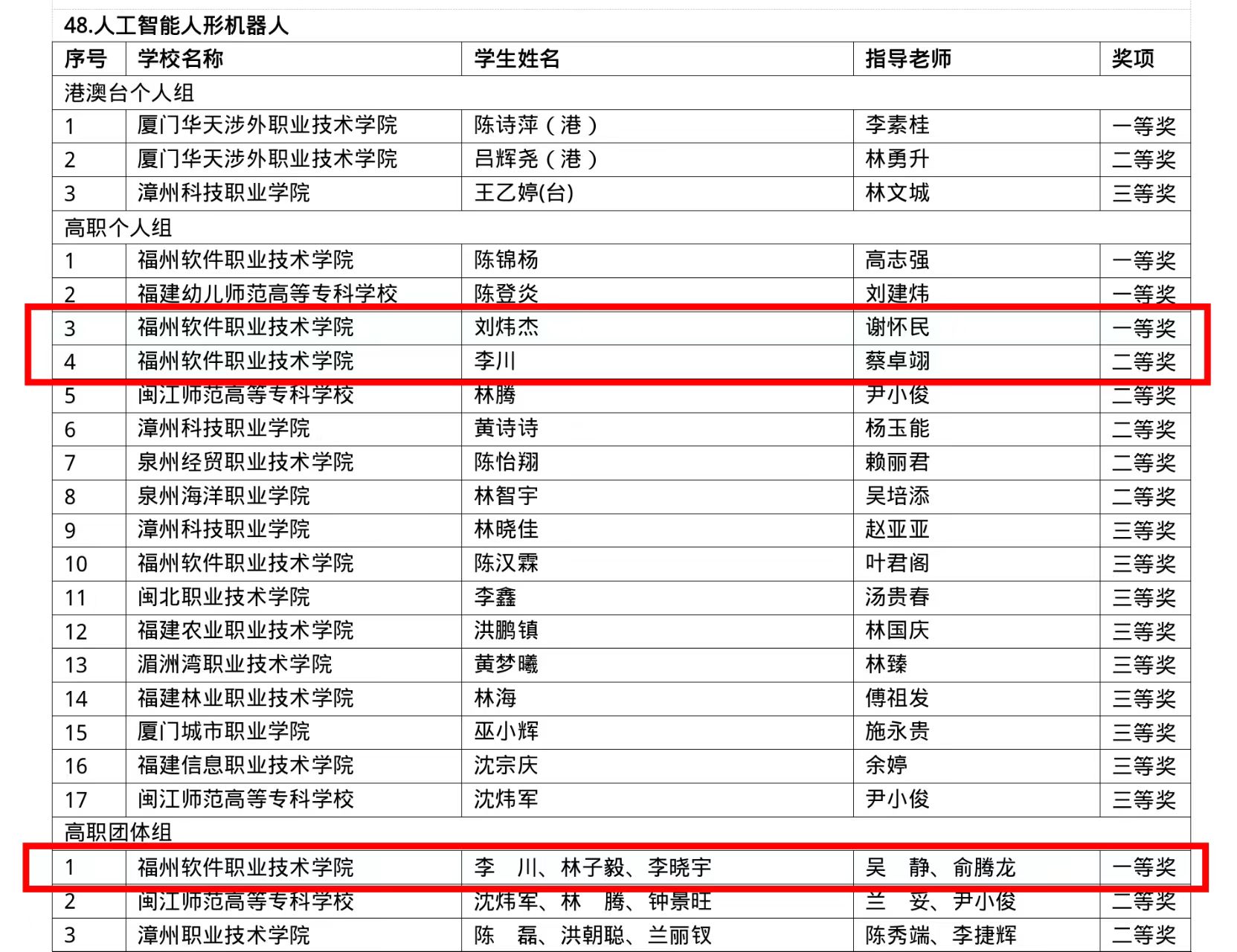 近日,福建省教育厅公布第十一届海峡两岸暨港澳大学生职业技能(能力)大赛及创新创业成果展获奖名单。其中,智能产业学院学子荣获“人工智能人形机器人”赛项高职个人组一等奖一项、二等奖一项以及高职团体组一等奖一项。