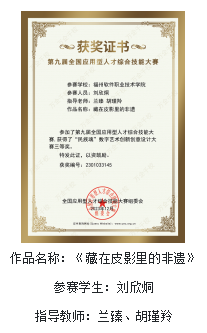 2023年12月12日,第九届全国应用型人才综合技能大赛“民族魂”数字艺术创新创意设计大赛圆满收官。本次大赛全程采用线上比赛的方式进行,由专家评委进行分组评审。我院建筑室内设计专业教师兰臻、孙牧含、胡瑾羚分别指导多名学生参加比赛,在指导教师与参赛同学的共同努力下喜获三等奖9项!另,三位老师均获得本次大赛“优秀指导教师奖”。