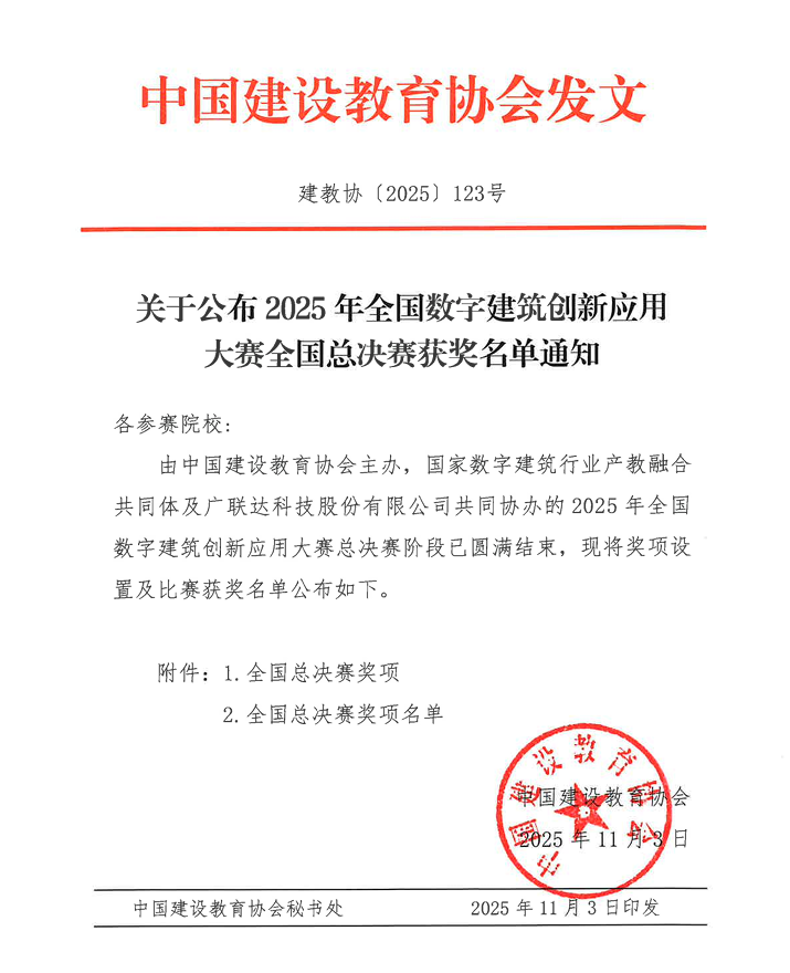 2025年10月18日,2025年全国数字建筑创新应用大赛全国总决赛--建设工程计量与计价应用赛项圆满收官。本次大赛由中国建设教育协会主办,国家数字建筑行业产教融合共同体及广联达科技股份有限公司协办,全国总决赛共有102支高校队伍参与角逐,赛事规格高、竞争激烈,是全国建筑类专业领域具有广泛影响力的权威赛事。